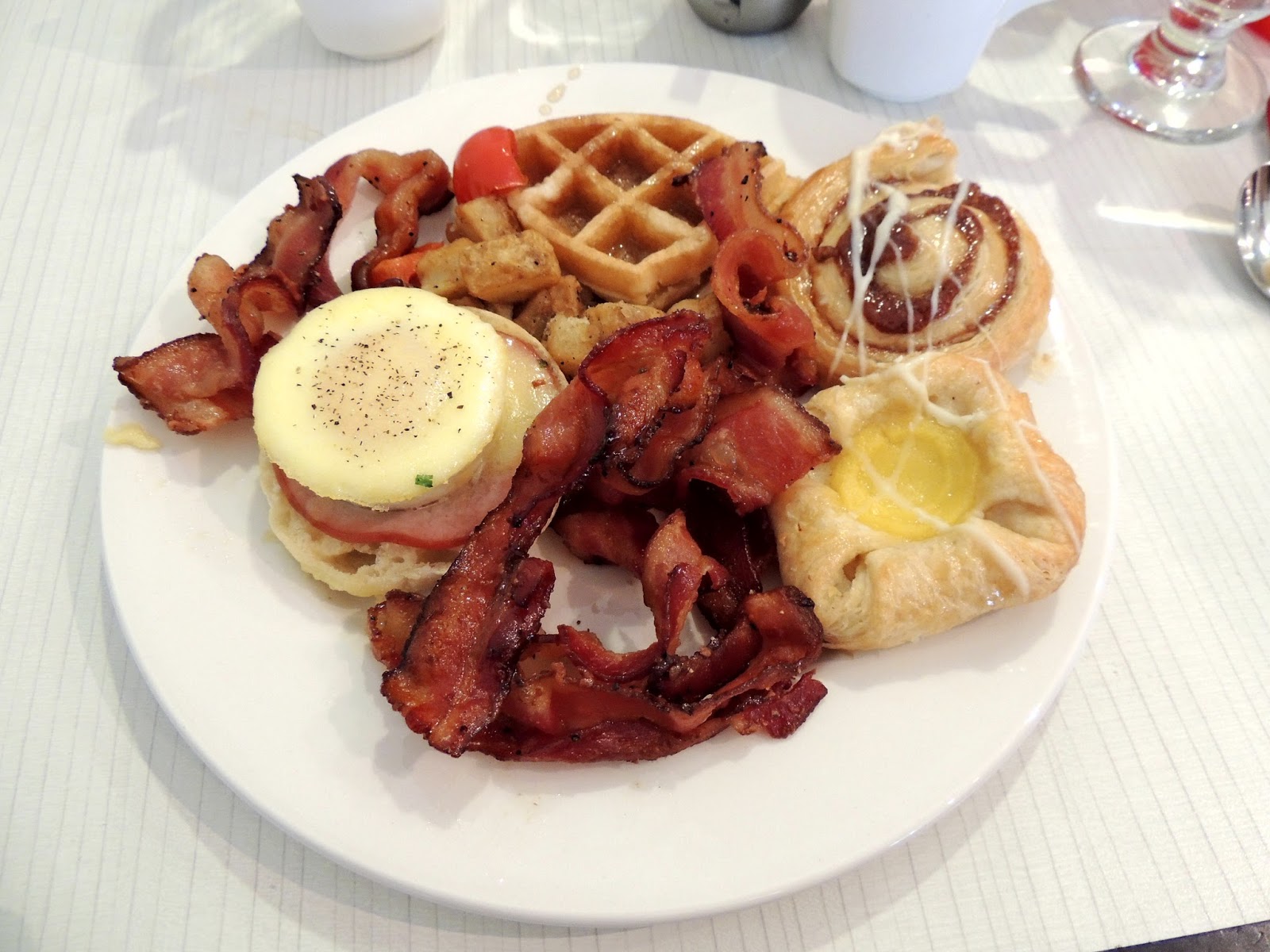 Well, clearly I overestimated the whole experience. We arrived, were seated, visited a bit and then went and saw the buffet. I first headed to the crab and boy what a let down! There was no big, overflowing plate of King Crab Legs There was a platter of meager amounts of unimpressive snow crab legs. Disappointment. I was pretty sure that there was sushi on the buffet - but no, so my son was disappointed. And the rest of the buffet was pretty standard fare buffet stuff - drying out in heating plates - the reason I don't like buffets. Well, that's not entirely fair - the bacon was excellent! It was maple bacon and is there really a bad bacon? The apple crisp for dessert was also excellent.